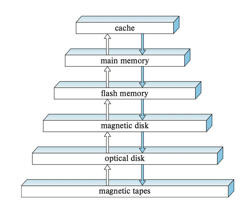 다양한 저장 매체는 속도와 비용에 따라서 다음과 같은 계층 구조로 나타낼 수 있다.
