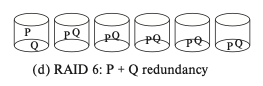 수준 6은 P+Q 중복 방법인데, RAID 수준 5와 유사하지만 복수의 디스크 실패를 대비하여 중복된 정보를 여분으로 저장한다.