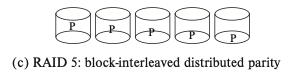 위 그림을 보면 모든 디스크에 걸쳐서 패리티 P를 분산 저장한다.