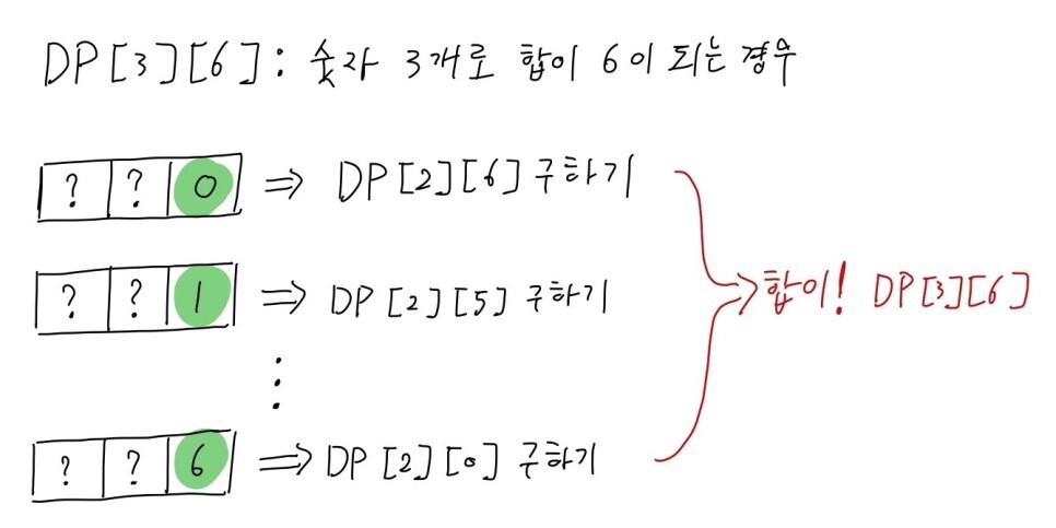 이러한 모든 DP[2][?]에 해당하는 경우의 수드을 합하면 DP[3][6]에 해당하는 경우의 수를 구할 수 있다.