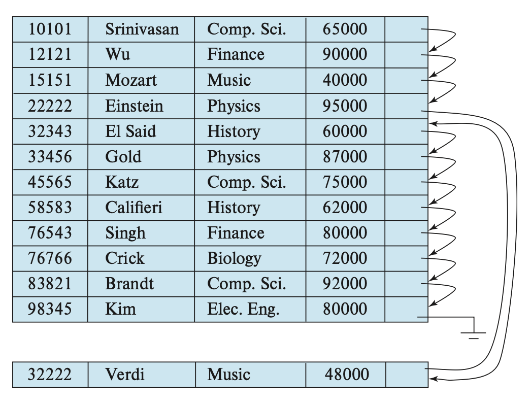 위 그림을 보면 첫 3개의 속석인 ID, name, dept_name은 가변 길이의 문자열이며, 레코드의 네번째 속성인 salary는 고정 길이 숫자이다.