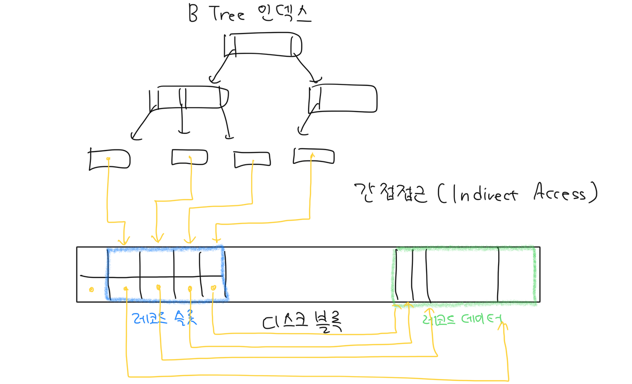 간접 접근을 하는 이유는, 레코드 데이터 삭제 시 레코드 데이터는 빈 자리를 메우기 위해 한칸씩 이동하는데, 이러면 외부에서(예: 인덱스 등) 레코드를 가리키는 포인터 주소를 전부 일일이 수정해줘야 하는 번거로움이 생깁니다.