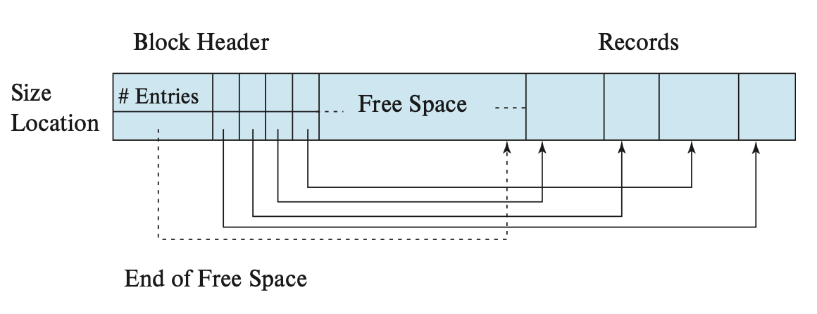 슬롯 페이지 구조(slotted-page structure)는 블록 내의 레코드를 구성하는 데 흔히 사용된다.