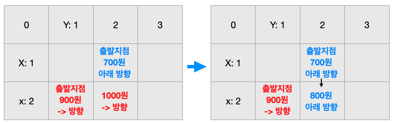 만일 2차원 배열을 사용했었다면, 위 그림과 같이 (2, 2)지역은 800원으로 저장되어 버린다.