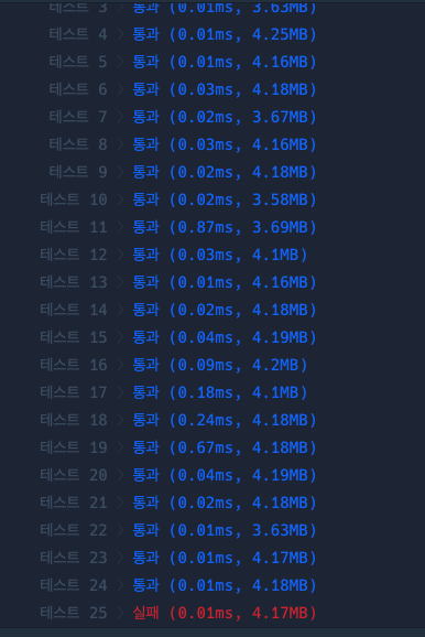 하지만 제출 결과 25번 테스트 케이스에서 통과를 할 수 없었다...