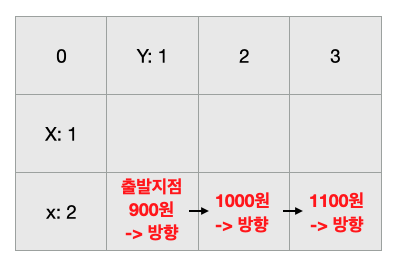 출발을 (2, 1)에서 시작해서 (2, 3)에 도착한다고 해보자, 이때 방향이 동쪽으로 모두 동일했기 때문에 100원씩만 추가되서,