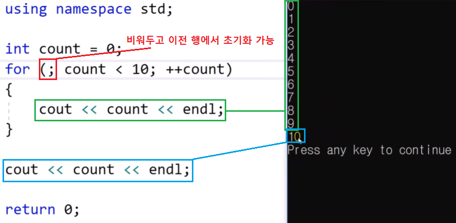 for문의 조건식 안에서 첫 초기화 부분과, 두번째 조건부분을 둘다 비울수도 있다.