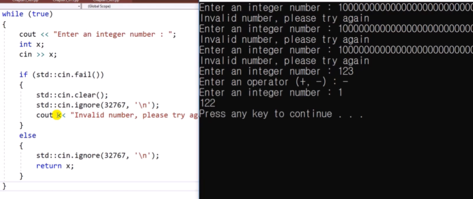 cin.clear : cin 객체의 상태flag 값을 초기화 하여 다시 cin이 정상작동 하도록 한다.