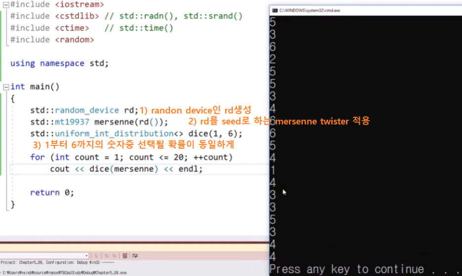 이전까지 C에서는 seed로 시간은 주어서 난수를 생성하는 방식을 공부했었는대, C++ 에서는 아예 난수 라이브러리가 있어 이를 활용하는 법을 배웠다.