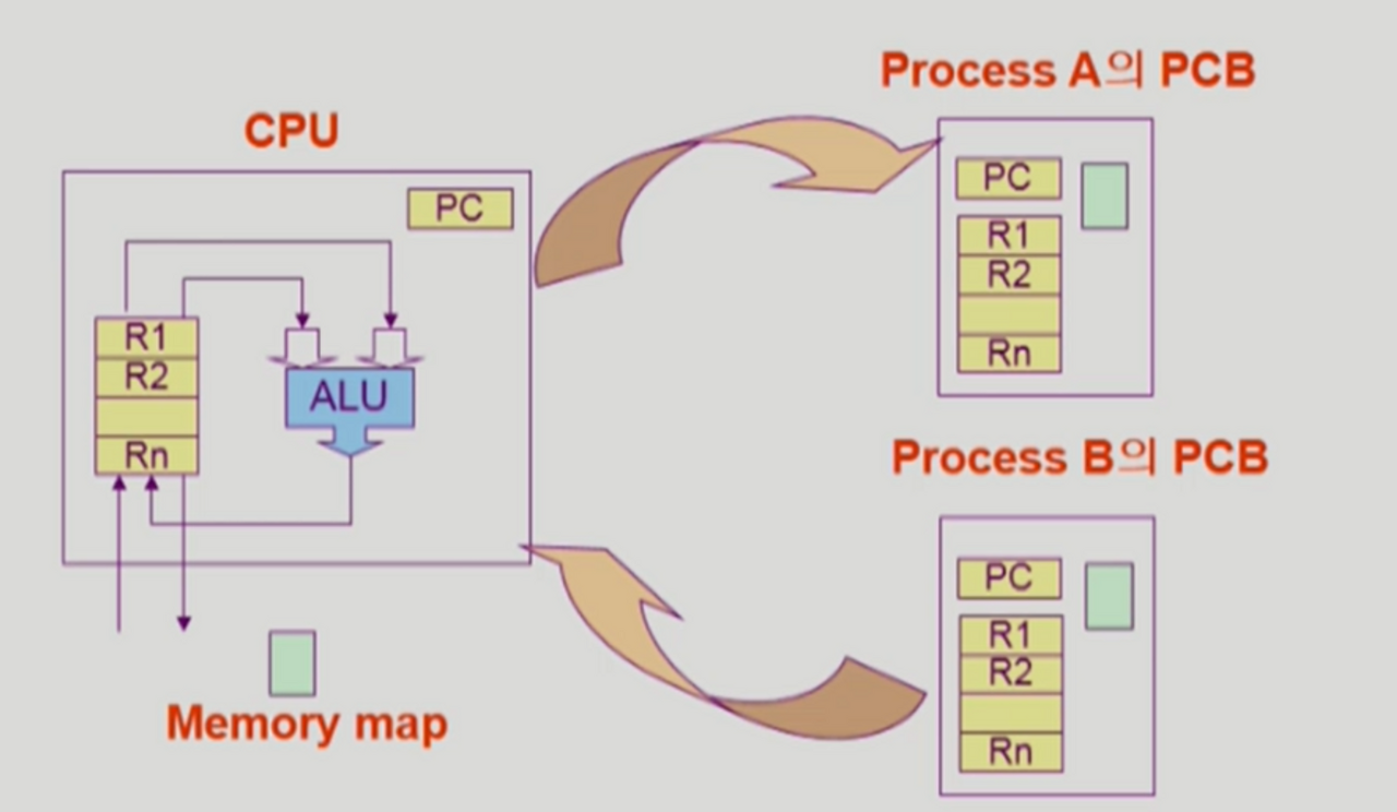 문맥 교환 중에 원래 CPU를 보유하고 있던 프로세스는 프로그램 카운터 값과 레지스터 값, 메모리 맵 등 프로세스의 context를 자신의 PCB에 저장하고, 새롭게 CPU를 할당 받을 프로세스는 예전에 저장했던 자신의 context를 PCB로부터 실제 하드웨어로 복원하여 이전 작업을 계속해서 수행한다.
