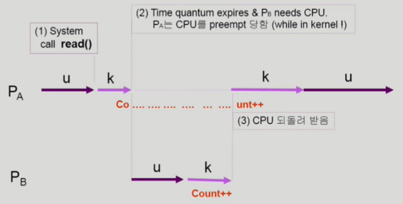 이를 해결하기 위해 커널 모드에서 수행 중일 때는 CPU 할당 시간이 끝나도 선점당하지 않는다, 사용자 모드로 돌아갔을 때 선점 당한다.
