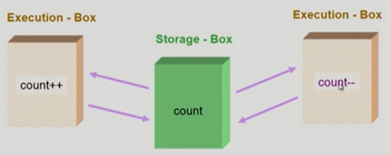 A에 의해 먼저 count + 1이 저장소에 저장되었다가, 이후 B가 연산하여 count - 1값이 최종적으로 변수에 덮어 씌워져 버린다.