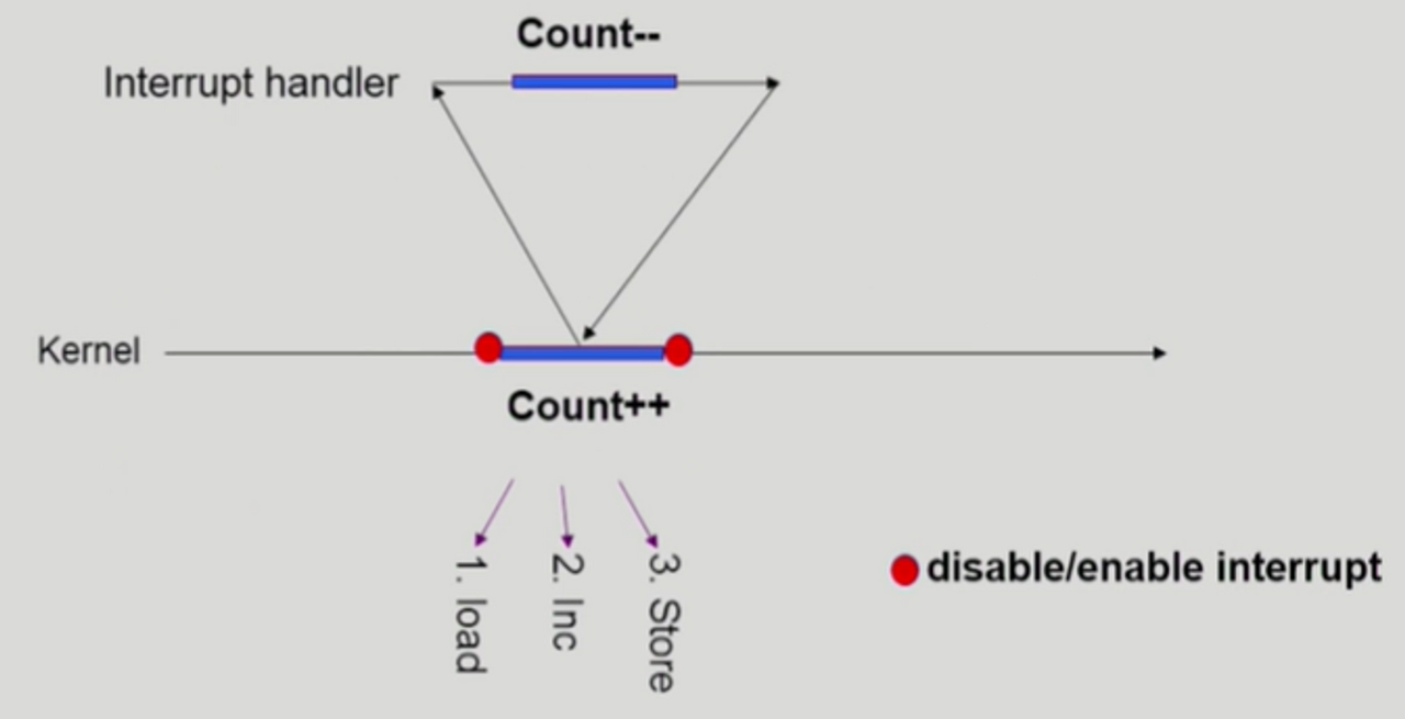 커널이 증감 연산을 할 때 메모리에서 count 변수를 load하고, count 변수를 증감하고 count 변수를 메모리에 store하는 3가지 연산이 발생한다.