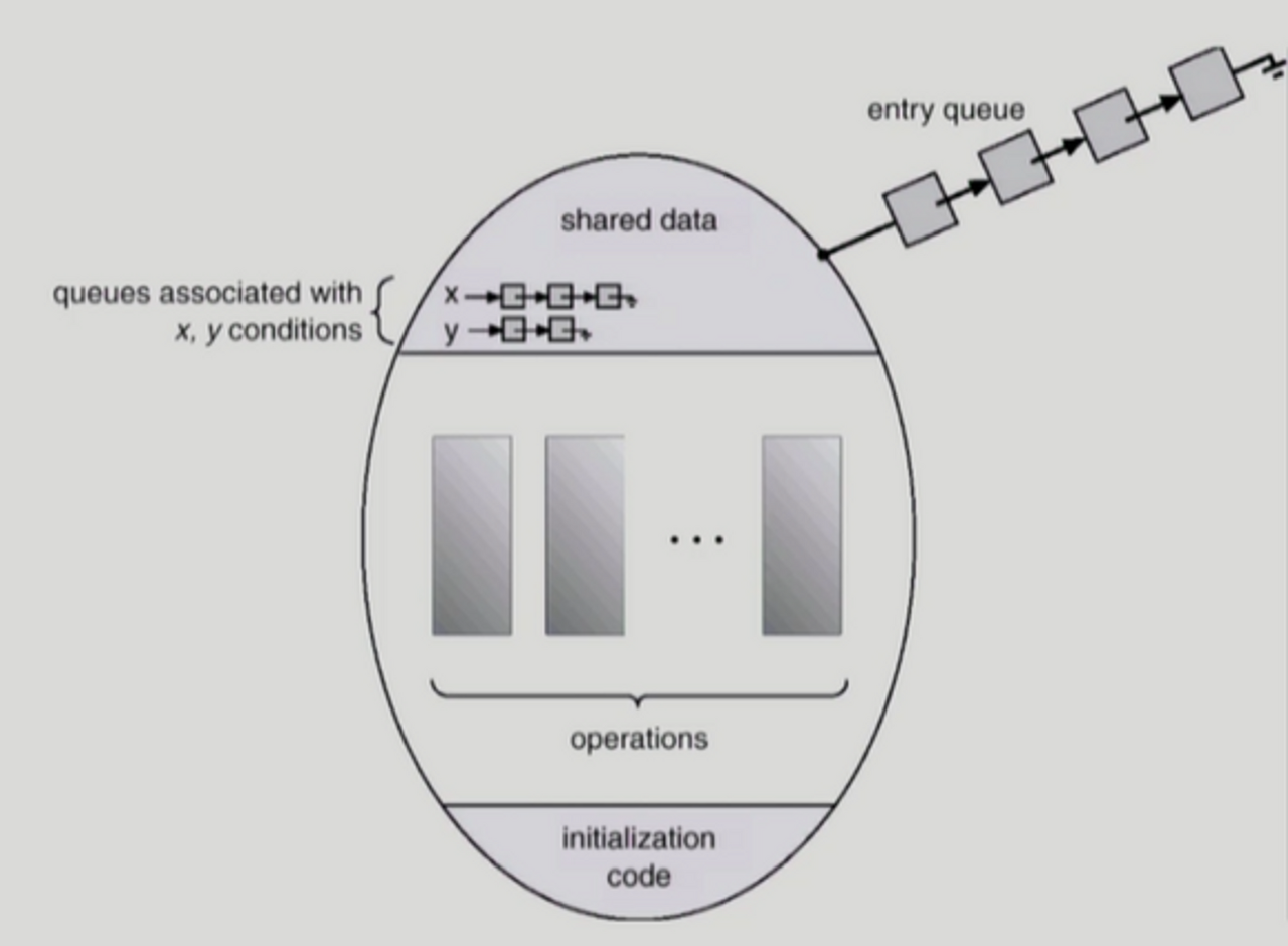 프로세스가 공유 데이터에 접근하기 위해서는 위와 같이 모니터 내부의 프로시저(함수)를 통해서만 공유 데이터를 접근할 수 있도록 설계한다. 이는 객체지향 스럽다 할 수 있는것 같다?