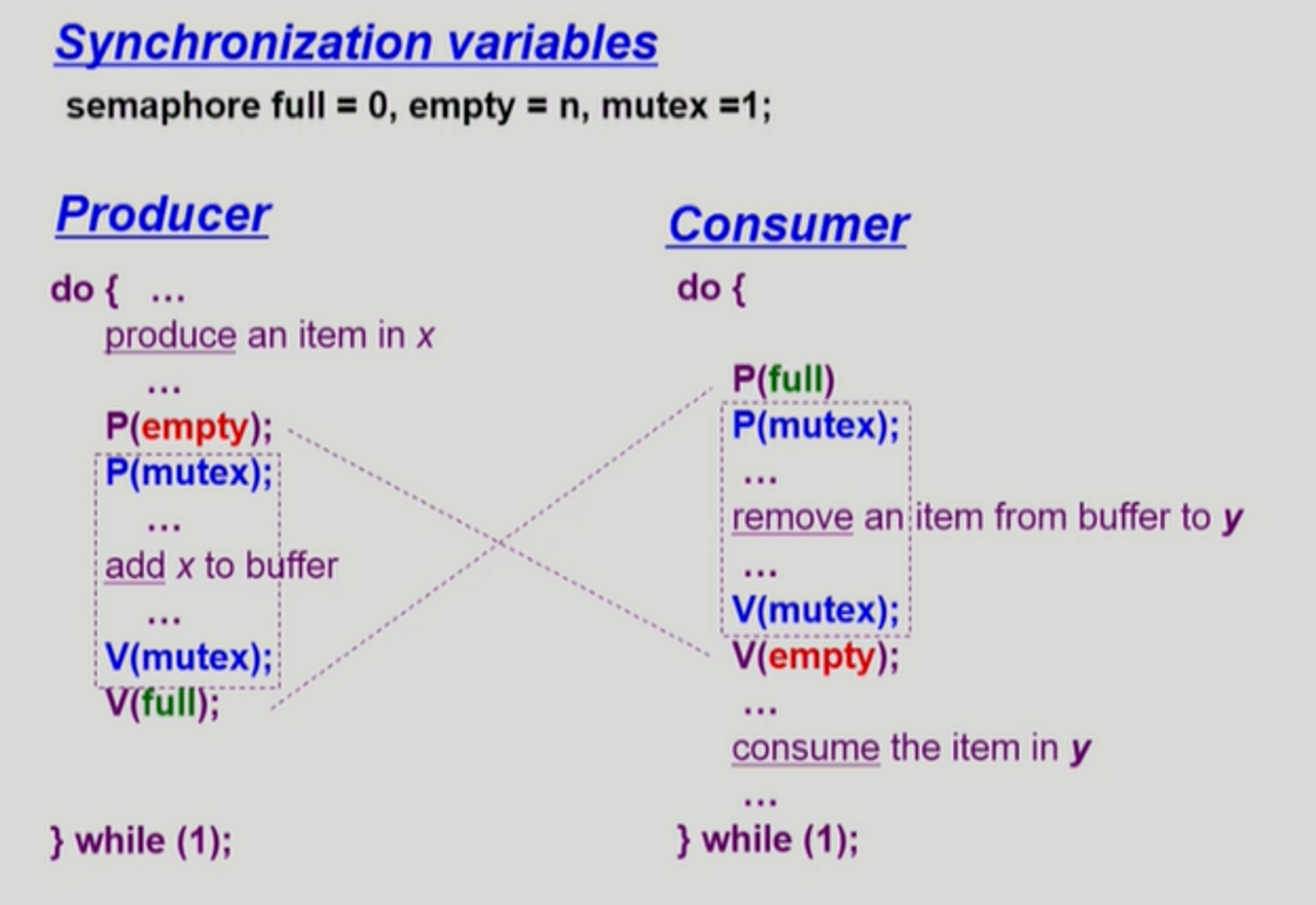 - P 연산을 통해 full변수를 사용하여 내용이 들어있는 버퍼가 있는지 확인한다. 없으면 대기