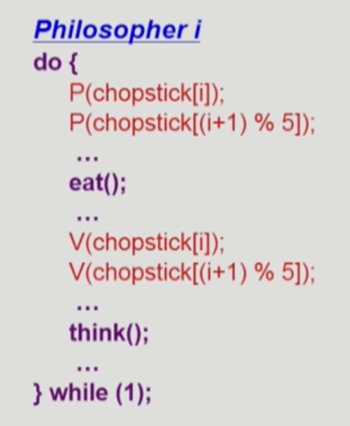 모두가 배고파서 동시에 왼쪽 젓가락을 드는 순간 오른쪽 젓가락을 들 수 없으므로 서로가 필요로 하는 자원을 무한히 기다리게 되는 Deadlock이 발생한다는 문제가 있다.