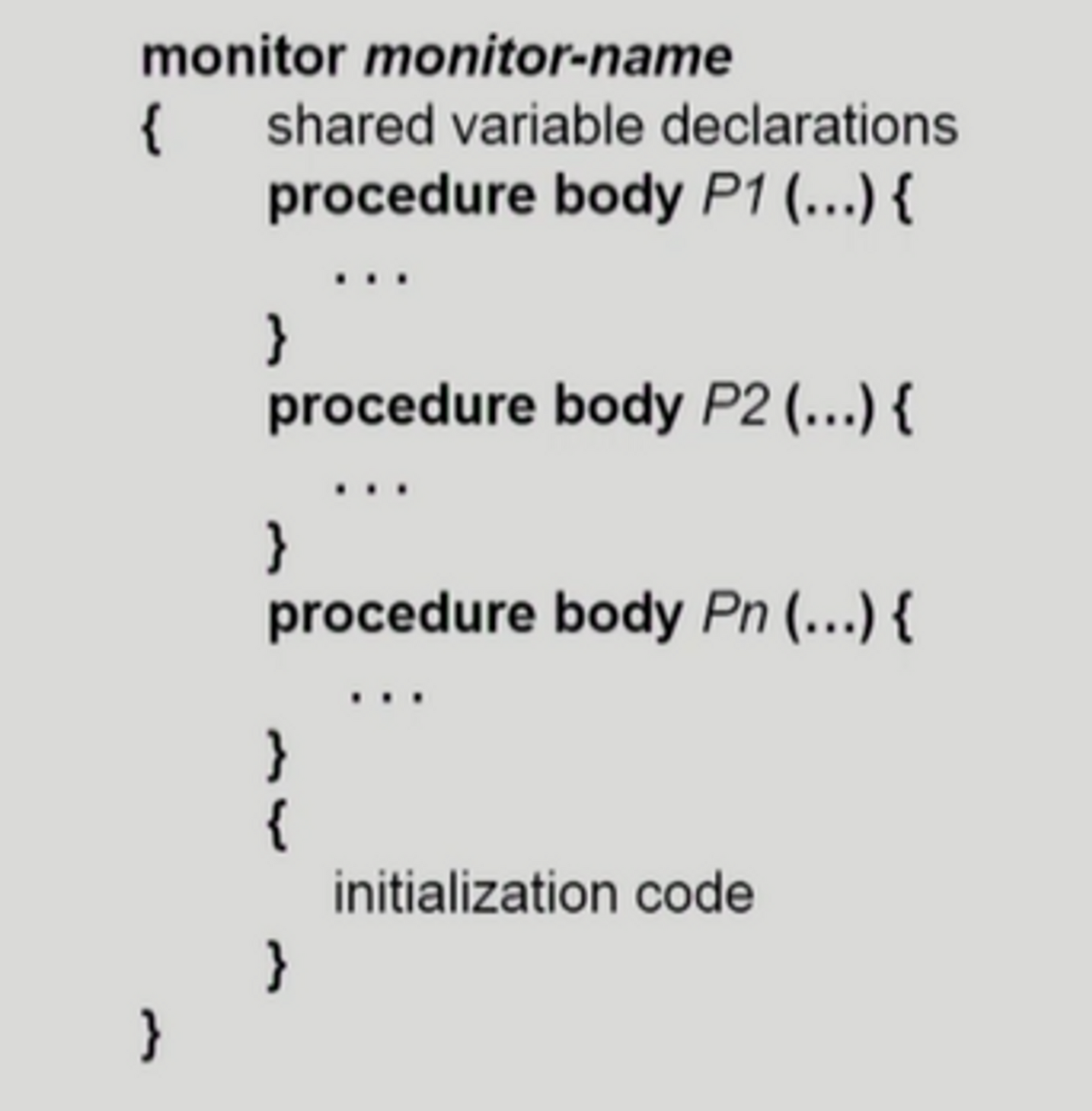 예를 들어 공유 데이터들이 있으면 밖에서 직접적으로 접근할 수 있는 것이 아니라, 모니터 내부에 공유 데이터에 접근하는 프로시저(함수)를 정의해 놓고 이 프로시저를 통해서만 접근하게 제어한다.