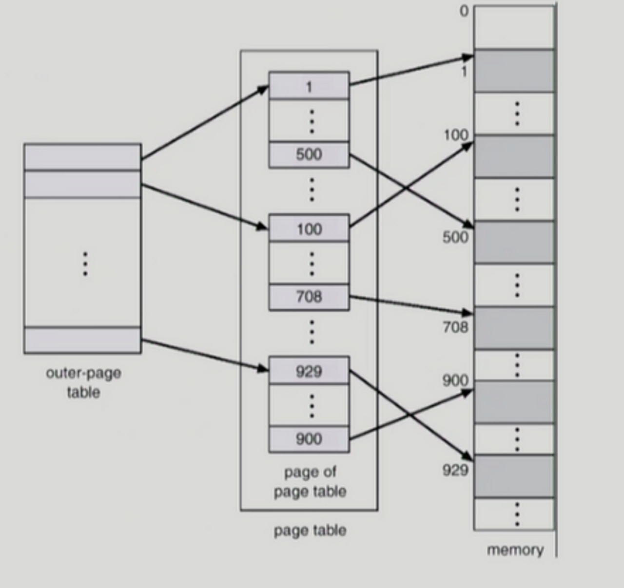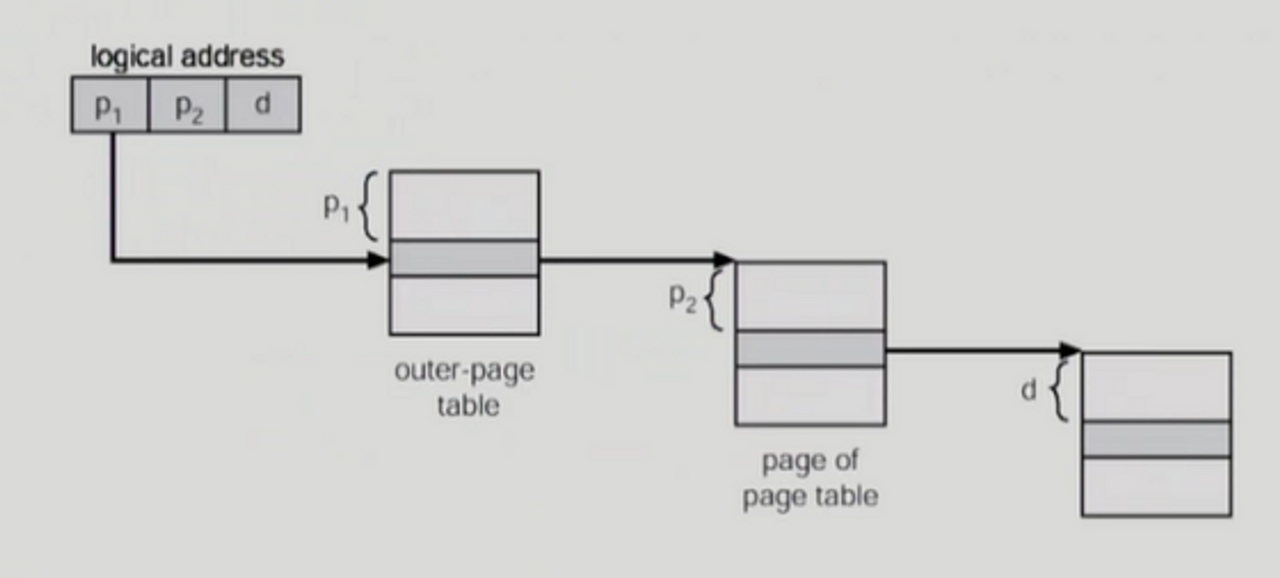 외부 페이지 테이블로부터 P1만큼 떨어진 위치에서 내부 페이지 테이블의 주소를 얻게 되고, 내부 페이지 테이블로부터 P2만큼 떨어진 위치에서 요청된 페이지가 존재하는 페이지 프레임의 위치를 얻은 후, 해당 프레임으로부터 d만큼 떨어진 곳이 바로 찾으려는 물리적 주소이다.
