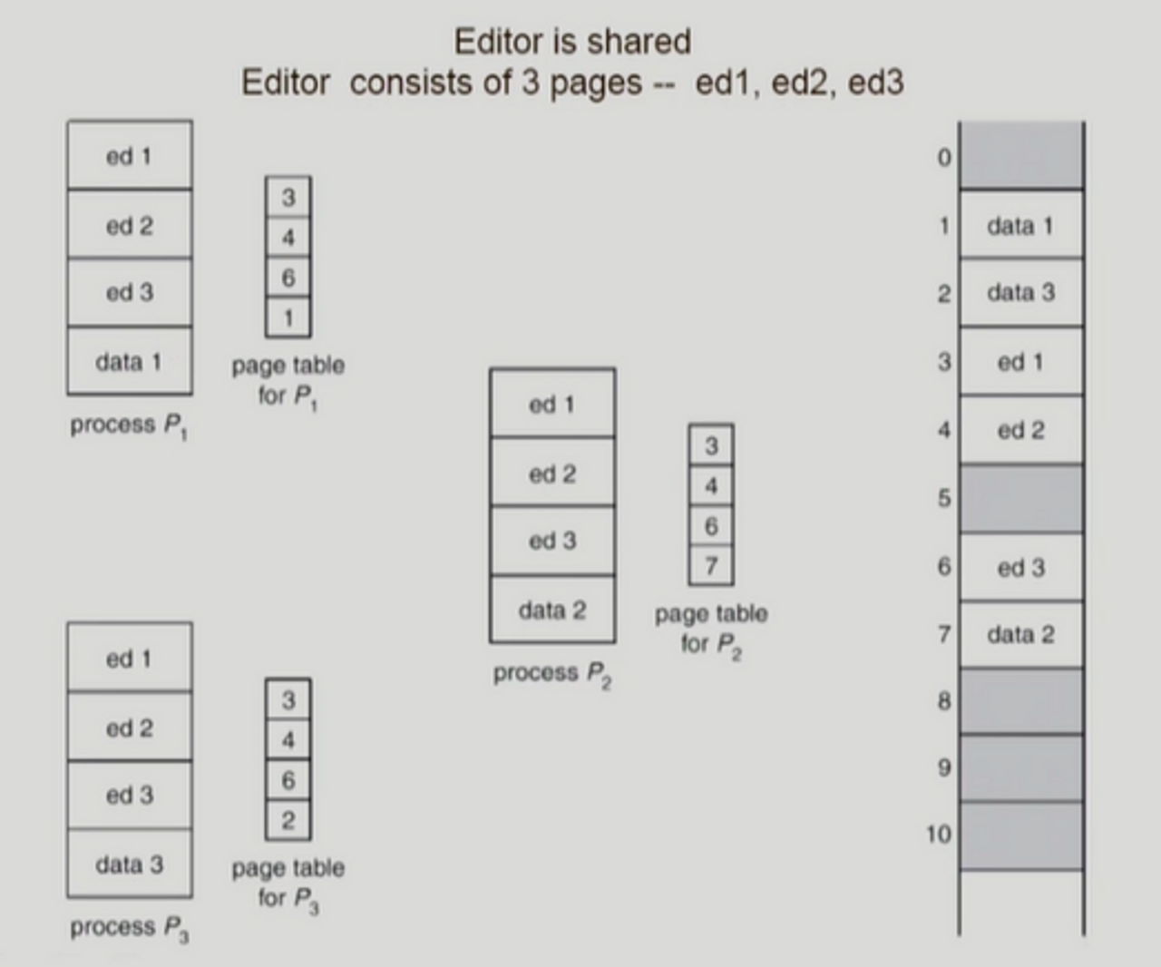ed 1, ed 2, ed 3는 shared page이고, data 1, data 2, data 3는 private code이다.