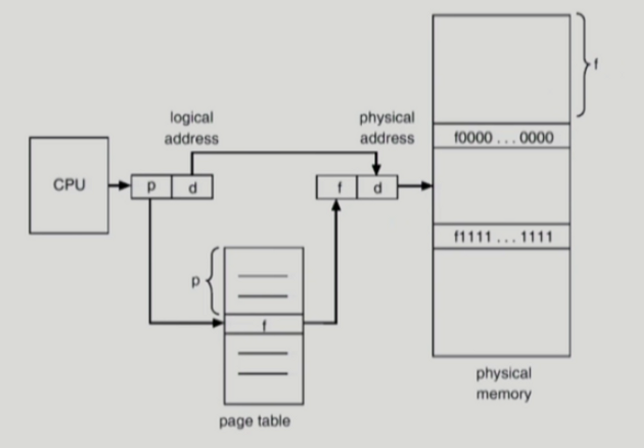위 그림에서 f (물리적 주소의 시작 위치) + d를 취하면 처음에 CPU가 요청한 논리적 주소에 대응하는 물리적 주소가 된다.