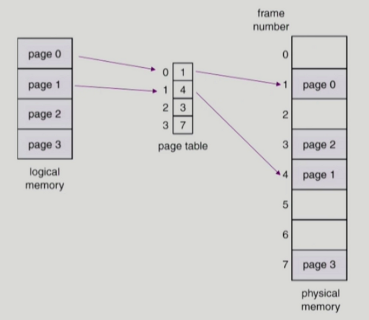 logical memory는 페이지 단위로 분할이 되고, 물리적 메모리는 프레임 단위로 분할이 되어 서로 매칭된다.