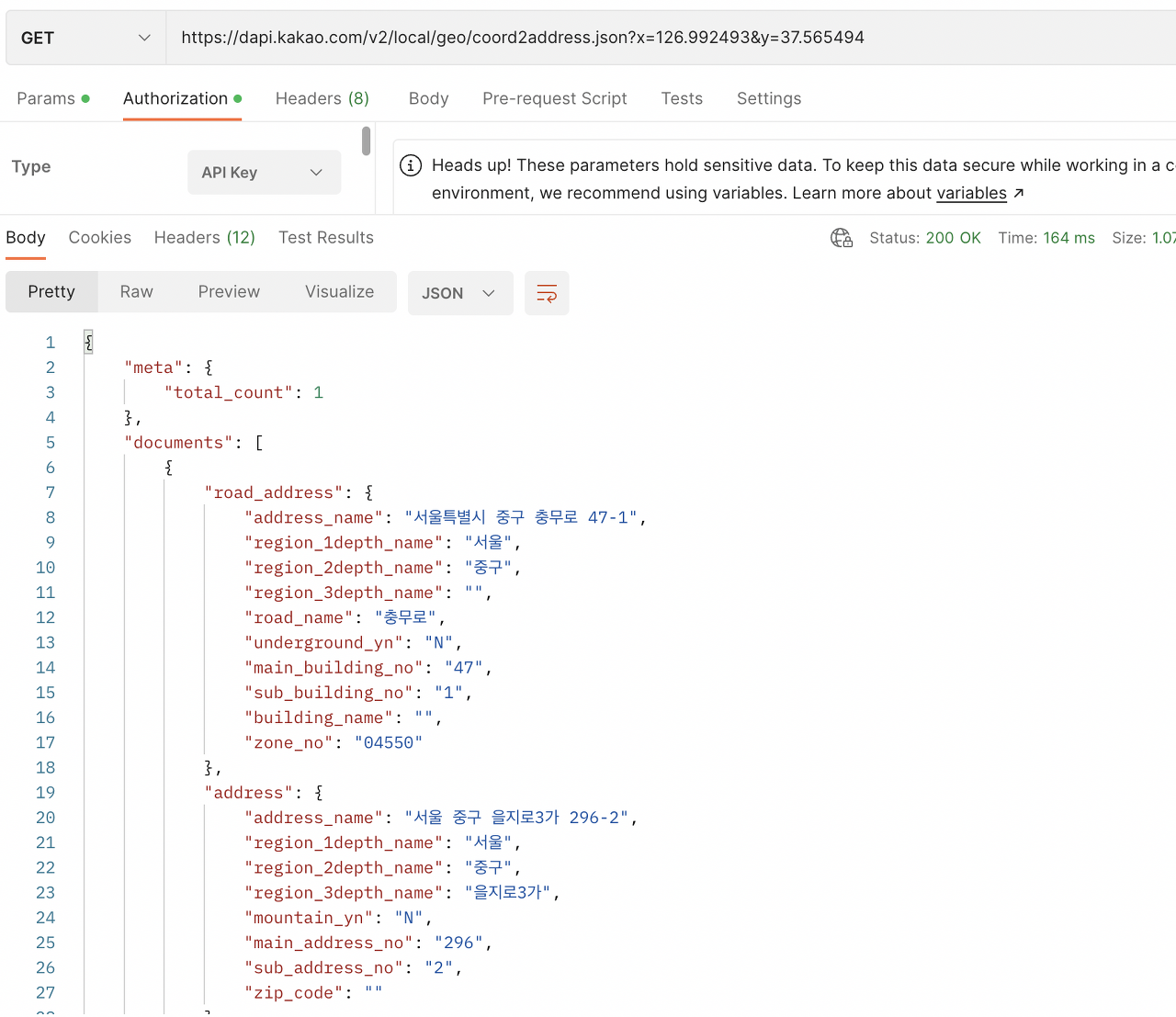 이를 사용하여 요청을 보내보면 다음과 같이 위경도를 통해 주소를 반환받을 수 있다.