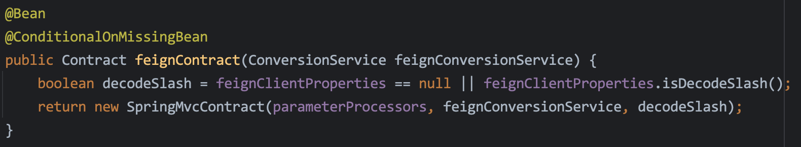 이때 Client에 따로 Configuration 설정을 해주지 않으면 디폴트인 FeignClientsConfiguration를 사용해서 생성하는데 default로 적용된 Contract는 SpringMvcContract였고 덕분에 SpringMvc의 어노테이션을 사용할 수 있었다.