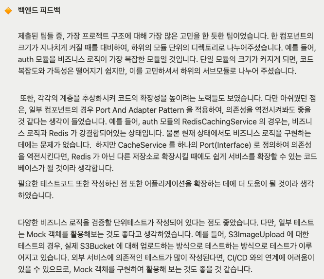또한 토스 4년 차 분께서 피드백을 해주셨는데, 우리 술술의 백엔드가 가장 우수한 아키텍처를 만들기 위해 많은 노력을 한 것 같다고 칭찬해주셨다!