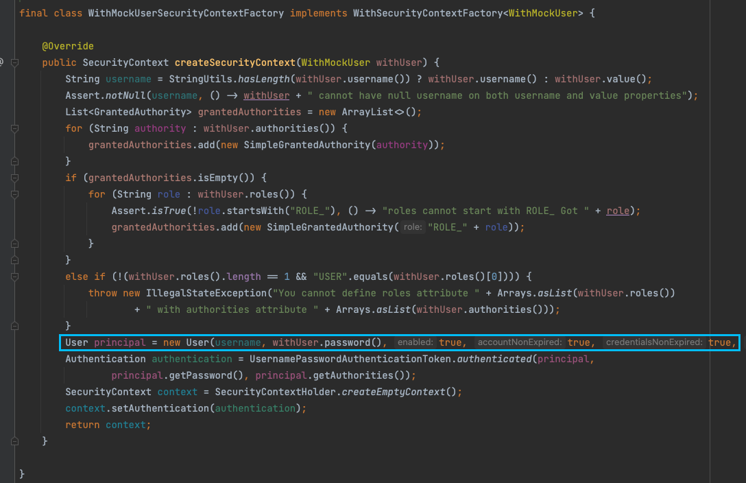 @WithMockUser 테스트에 추가하면 WithMockUserSecurityContextFactory를 통해 Authentication을 생성하고 등록한다.
