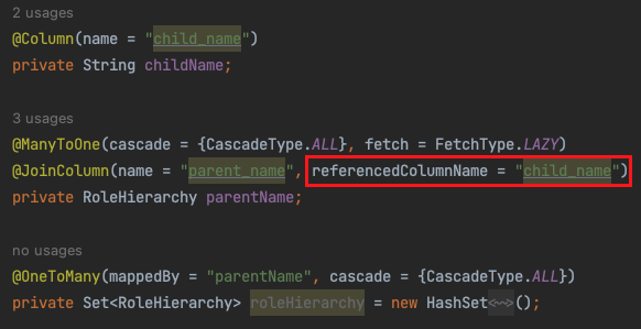 RoleHierarchy라는 Entity에서 필드로 String childName을 가지고 있다.