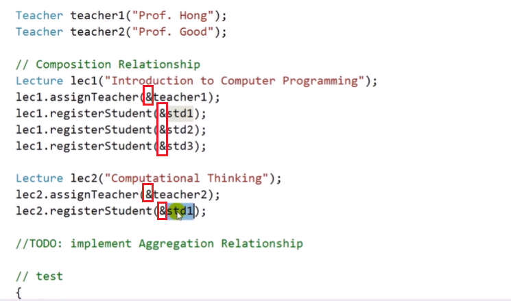 또한 기존의 composition에서는 lecture의 인스턴스가 사라지면 그에 속한 학생과 선생이 모두 사라졌지만, student의 포인터를 활용한다면 가리키는 포인터는 사라질 지언정 대상인 값 자체는 사라지지 않는다.