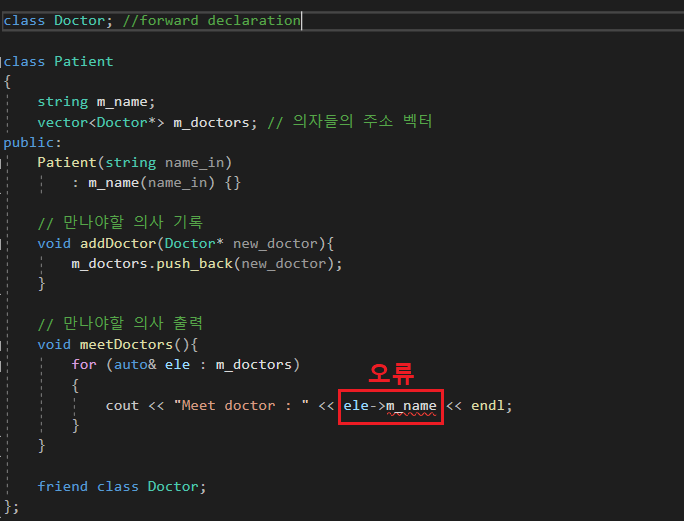 우선 전방선언으로 Patient class위에 Doctor를 선언해 주었다. 따라서 뒤이은 Patient class에서는 Doctor라는 class까지는 존제하는것을 알고있다. 하지만 다음 코드에서 문제가 생긴다.