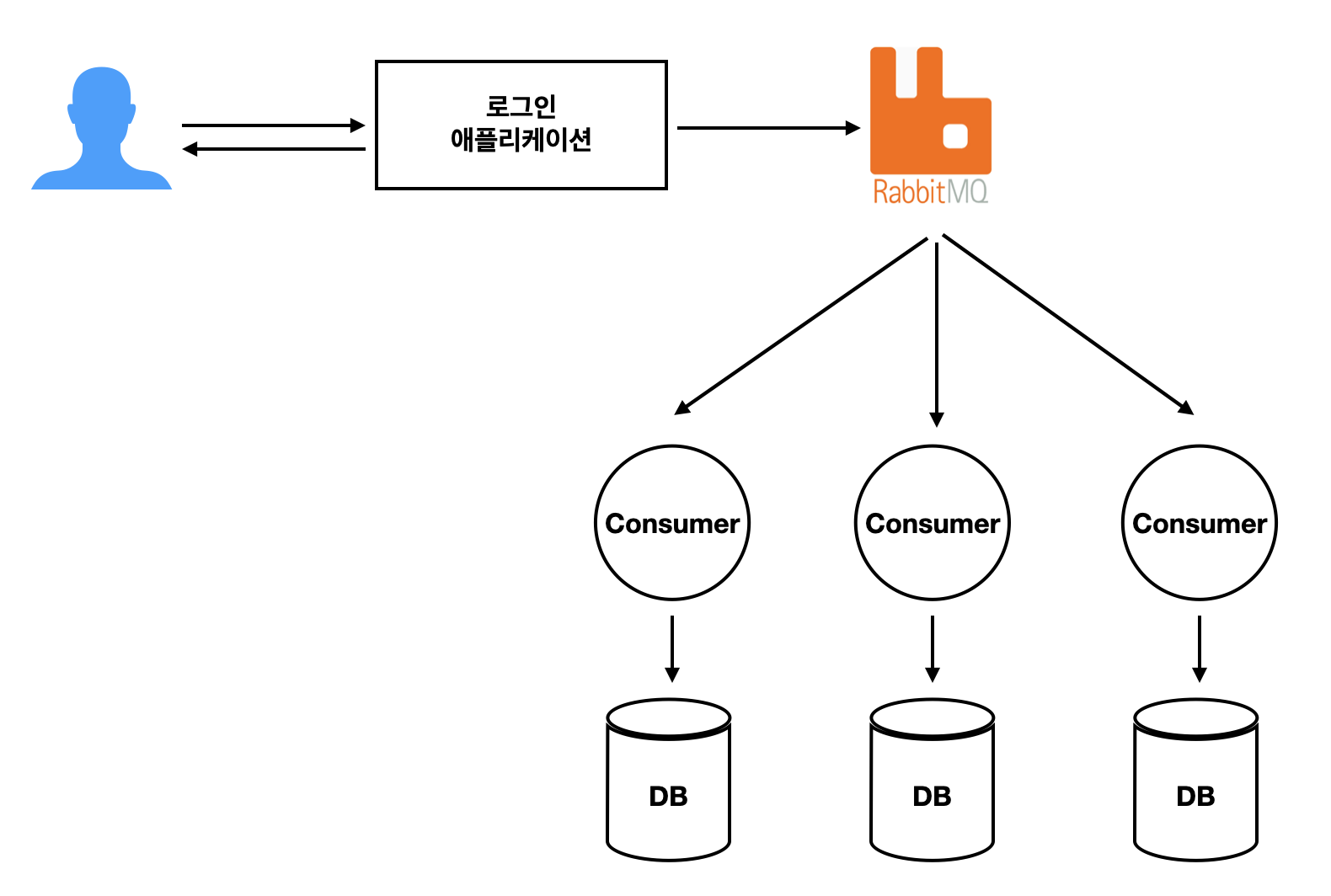애플리케이션과 데이터베이스의 의존성을 분리해서 강결합 구조를 약결합 구조로 변경할 때, 메시지 지향 미들웨어인 RabbitMQ는 데이터베이스에서 작업을 수행하기 전 데이터의 중개자 역할을 한다. Consumer는 RabbitMQ 서버에서 데이터를 가져와서 DB에 작업을 수행한다.