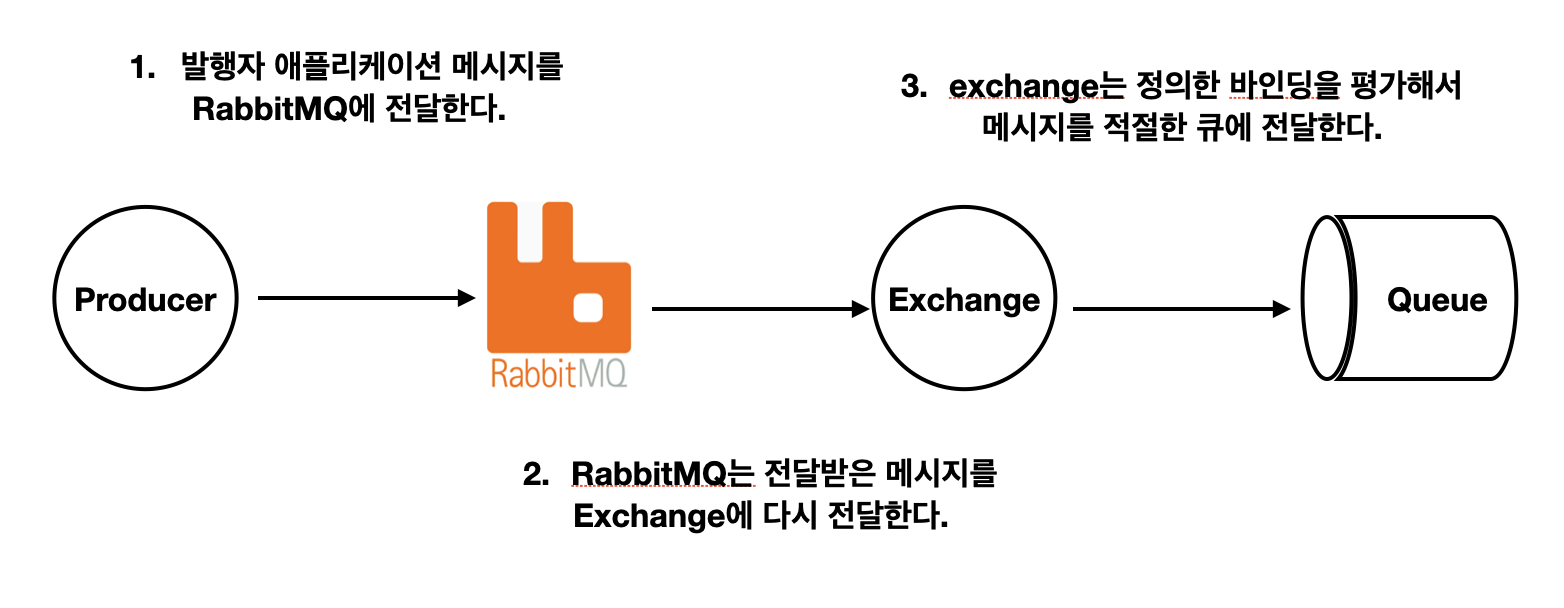 2) RabbitMQ가 메시지를 받고 exchange에 전달한다