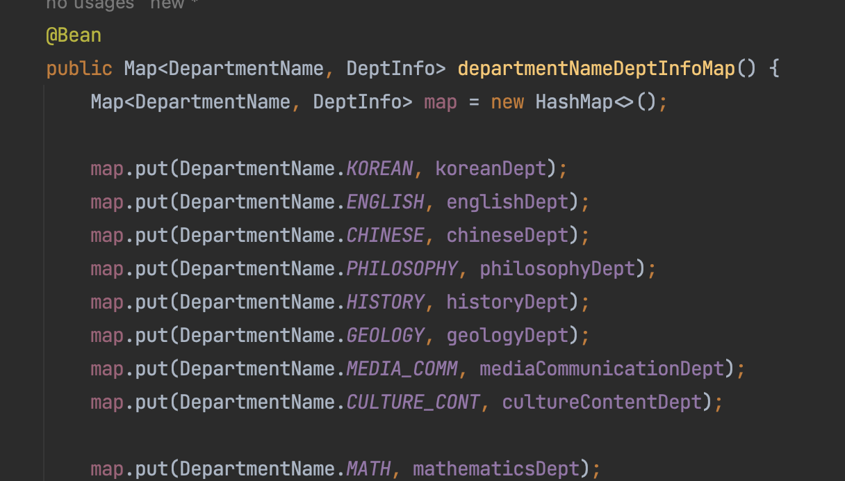 이를 통해 map을 필요한 곳에서 전달받아 enum을 key로 사용하여 해당 학과의 정보를 사용하는 코드이다.