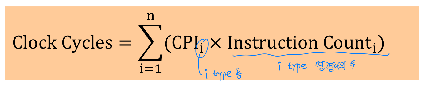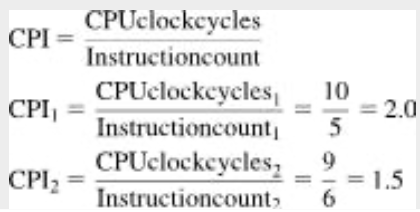 명령어의 개수와 CPI를 사용하여 CPU 클럭 사이클 수를 계산하는 다음 공식을 이용하면 각각의 코드에 대하여 클럭 사이클 수를 계산할 수 있다.