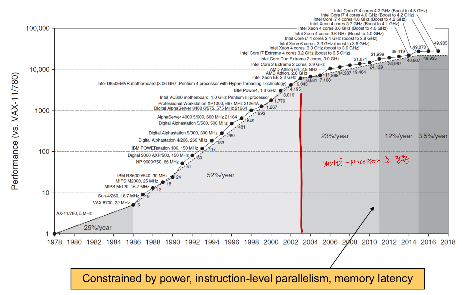다음 그림은 아미크로프로세서의 프로그램 응다비간 개선 추세를 보여준다. 개선 속도가 2002년부터 매년 1.5배에서 1.03배로 둔화되었다