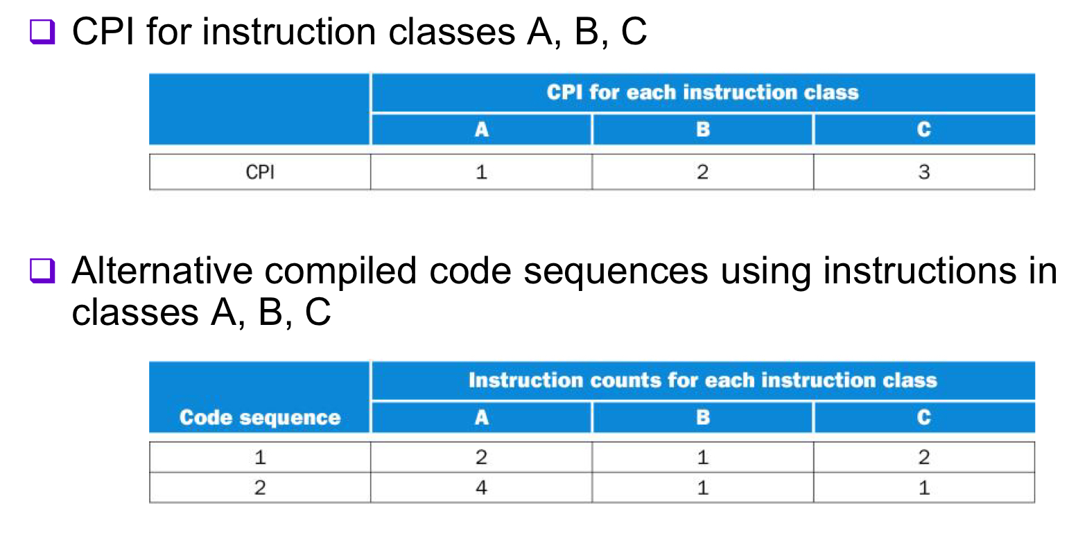 CPI는 명령어 배합(instruction mix)에 따라 달라지므로 클럭 속도가 같더라도 명령어 개수와 CPI는 반드시 비교해야 한다.