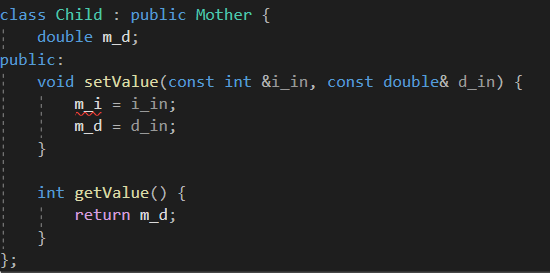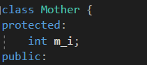 하지만 위의 코드를 보면 2번째 오류가 생긴다. m_i는 mother class의 private 멤버변수라 child에서 접근을 못하고 있는 상황이다. 이를 해결하기 위해 Mother class 에서 멤버변수를 public으로 해주면 급급하게나마 해결이 가능하다. 하지만 이는 캡슐화 라는 class의 이념에 반대되는 행위이다. 이때 사용할 수 있는것이 바로 protected이다.