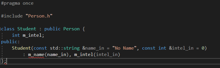 아래의 코드는 이렇게 만든 Person.h 를 Student.h에서 include하고 상속받고있는 모습이다.