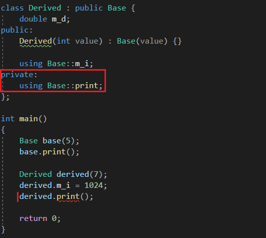 derived.print()에서 빨간줄로 경고가 나타나고있음을 확인할 수 있다. 즉 Base에서는 print() 사용이 가능하지만 Derived에서는 사용 불가능해진 것 이다.