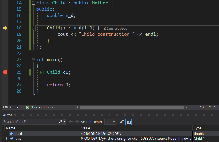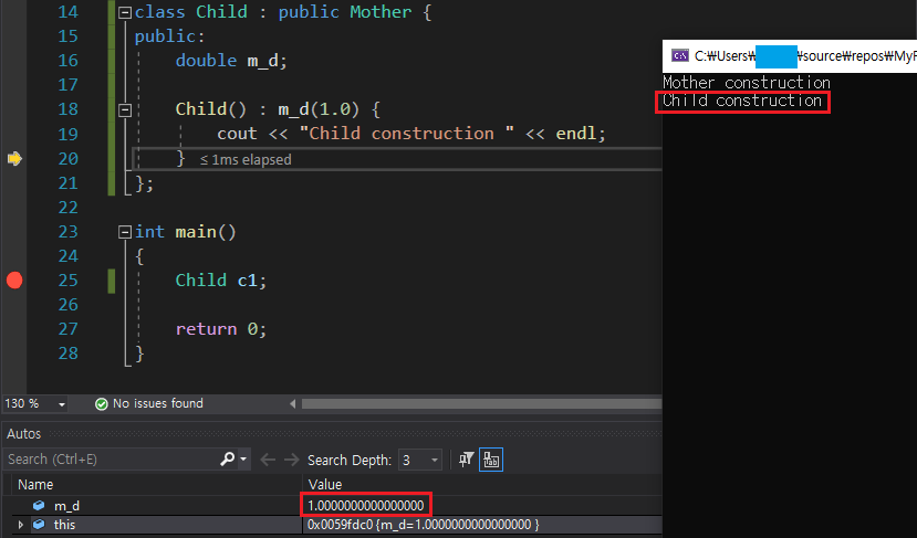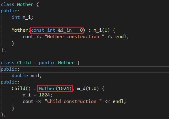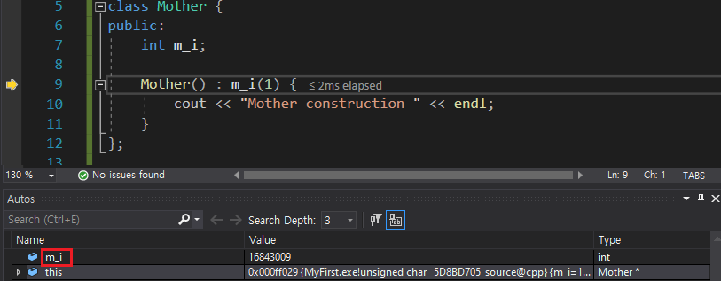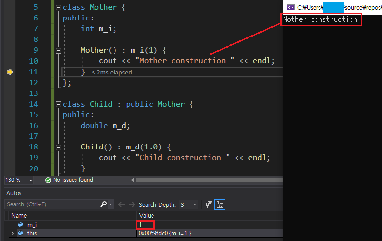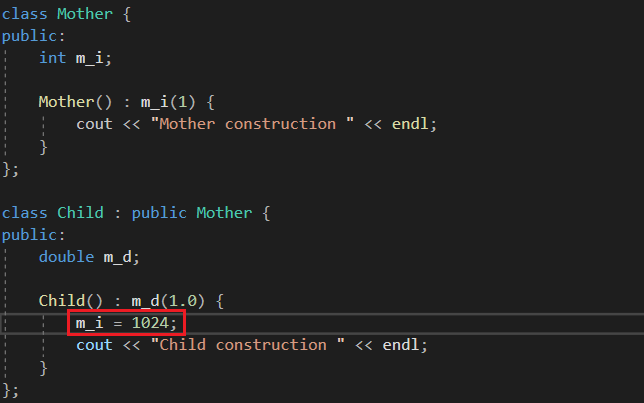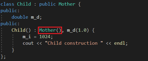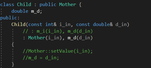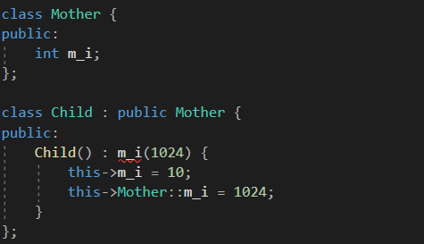 Child class는 Mother class를 상속받고있다. 따라서 Child class에서도 m_i라는 부모의 멤버변수를 사용할수있다(public임). 위의 코드를 보면 this->m_i = 10; 과 같이 사용중 인것을 볼 수 있다. 하지만 m_i(1024)로 초기화 하려들면 에러나 나타난다. 왜그럴까?? 이는 앞에서도 말한적이 2번 있지만, 이번시간에 더욱 깊게 알아볼 것 이다.