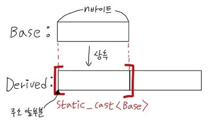 위의 코드를 보면 static_cast<Base>를 하고있는것을 볼 수 있다. 아직 감이 오지 않을 수 있다. 자식 class는 부모class로부터 상속을 받았고 따라서 내부적으로 부모class에 대한 정보를 메모리에 포함하고 있음을 기억하는가? 참고로 부모class의 정보가 메모리 앞주소에 먼저온다. 다음 나의 그림을 보면 조금더 이해갈 수 있다. (엄밀할 그림은 아니니 이해용도로만 사용해주길 바란다)