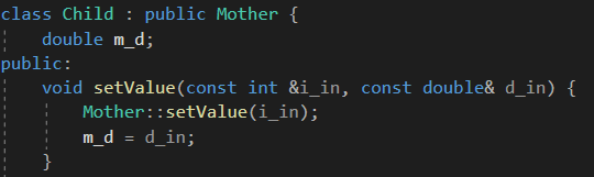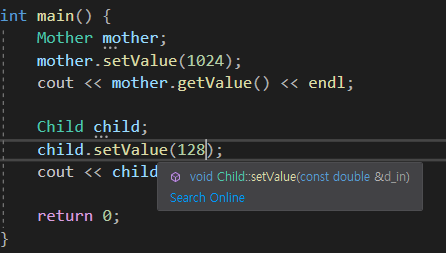 우선 답부터 말하면 Child class에서 호출하는 setValue, getValue함수는 child class의 것 이다. 이름이 같다면 Child class에서는 Child class의 함수가 우선순위가 높으며, 자기의 멤버함수를 먼저 호출하는 것이 상식적이다. 따라서 main에서 다음과 같이 매게변수가 double로 확인된다.