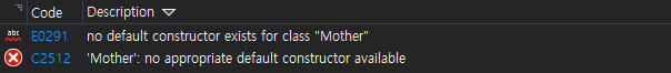 여기까지 하면 Child Class의 생성자는 만들어 줬다. 하지만 아직 Mother class의 생성자는 만들지 않았다. 만약 main함수에서