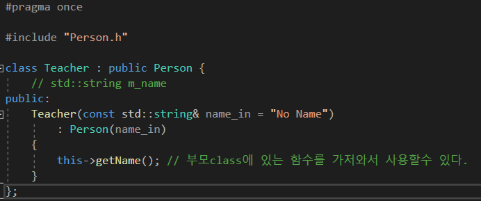 Teacher class안에서 부모class인 Person의 멤버함수인 getName()을 가져다가 사용할수가 있다.