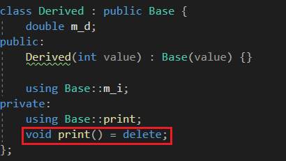 위의 코드에서는 Derived class 내부에는 print함수가 없는 상태이다. 하지만 Base에 있는 print함수를 상속받아 사용이 가능한것은 이전시간에 배워 익히 알고있다. 이번에는 그것을 막는방법에 대하여 배웠다. 방법은 간단하다.