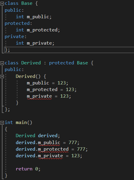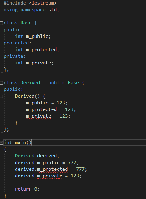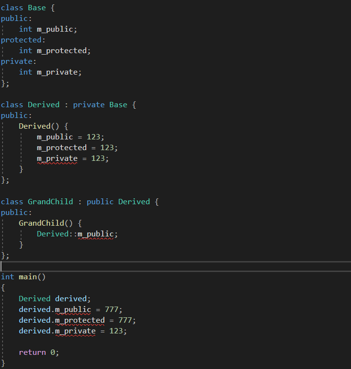 그렇다면 Base class의 m_protected와 비교해보면 누가 더 엄격한가? 둘다 같은 protected니까 protected가된다. 중요한 내용이 있는데 Derived class"안"에서 protected인것에 주목해야 한다. 무슨말인가? 할것이다. 위의 코드를 보면 Derived 안에서 m_protected가 123으로 대입되고 있는데, 이는 Derived class안에서 protected가 됬지만 같은class 안에서는 protected 멤버에 접근이 가능하기에 대입이 가능하다. 또한 Derived class안에서 protected가 되었다는 말은 Derived class를 상속받는 또다른 class에서 접근이 가능하다는 것 이다.