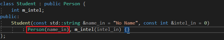 하지만 위의 코드를 보면 에러가 발생하고 있다. m_name에 접근하여 인자로 들어온 name_in을 넘겨주고 싶지만, m_name은 Person의 private 멤버변수이기에 에러가 발생한다. 11-1 에서 말했듯 Student의 인스턴스를 생성할때는 아직 m_name은 메모리를 할당받지 못한 상황이며, 더 나아가 m_name이라는 멤버변수의 1차적 책임은 Person에 있기에, 직접 변수에 접근하는 것이 아닌 Student에서 Person의 생성자를 호출하여 간접적으로 초기화 하는 것 이다. 즉, 생성자는 Person에게 있어야 한다.