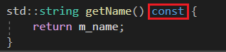 outstream 연산자 오버로딩에서 const 참조로 student인자를 받고있는데, 그 student에 대해 getName 함수를 사용하고 있어서 이름은 얻을수 있지만 변경할수 없는 상황이다. 따라서 getName함수에 const를 붙여 이름을 반환만 하고 바꾸지 않도록 해준다.